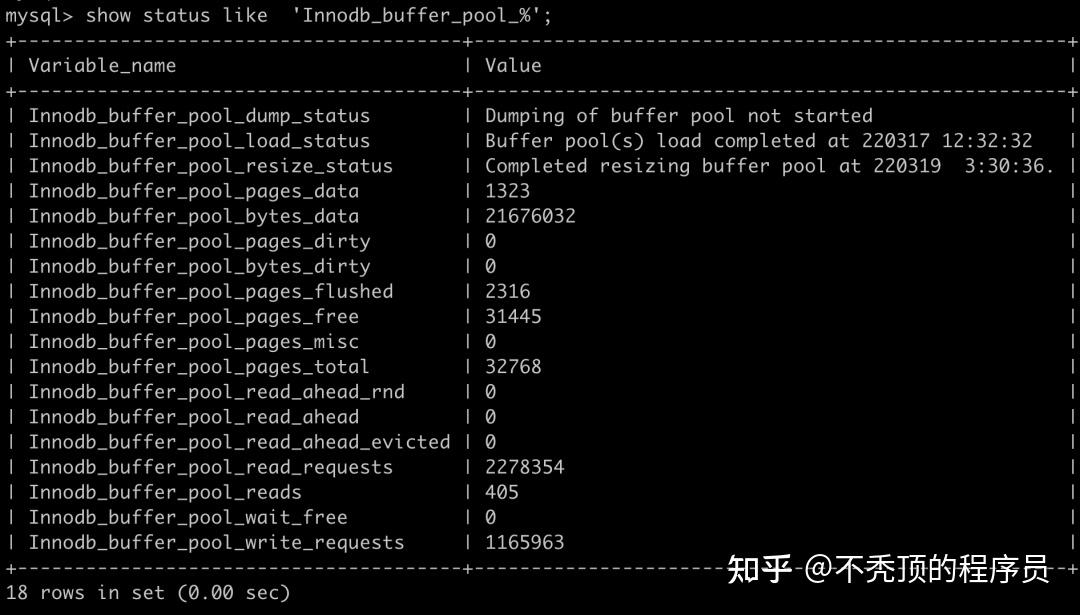 通过 show status like 'Innodb_buffer_pool_%';可以看到跟buffer pool有关的一些信息。