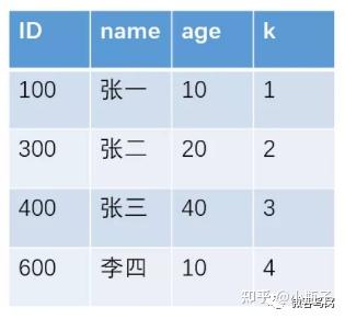 假设我们有如下表,ID是主键,字段 k 上有索引: