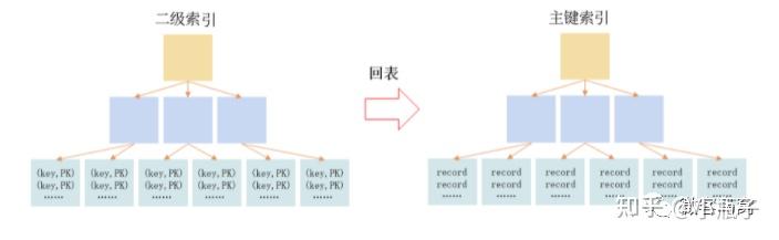 当通过使用二级索引来查询数据时,通过二级索引先找到主键值,再通过主键索引进行查询数据,这种「二级索引通过主键索引进行再一次查询”的操作叫作回表」。