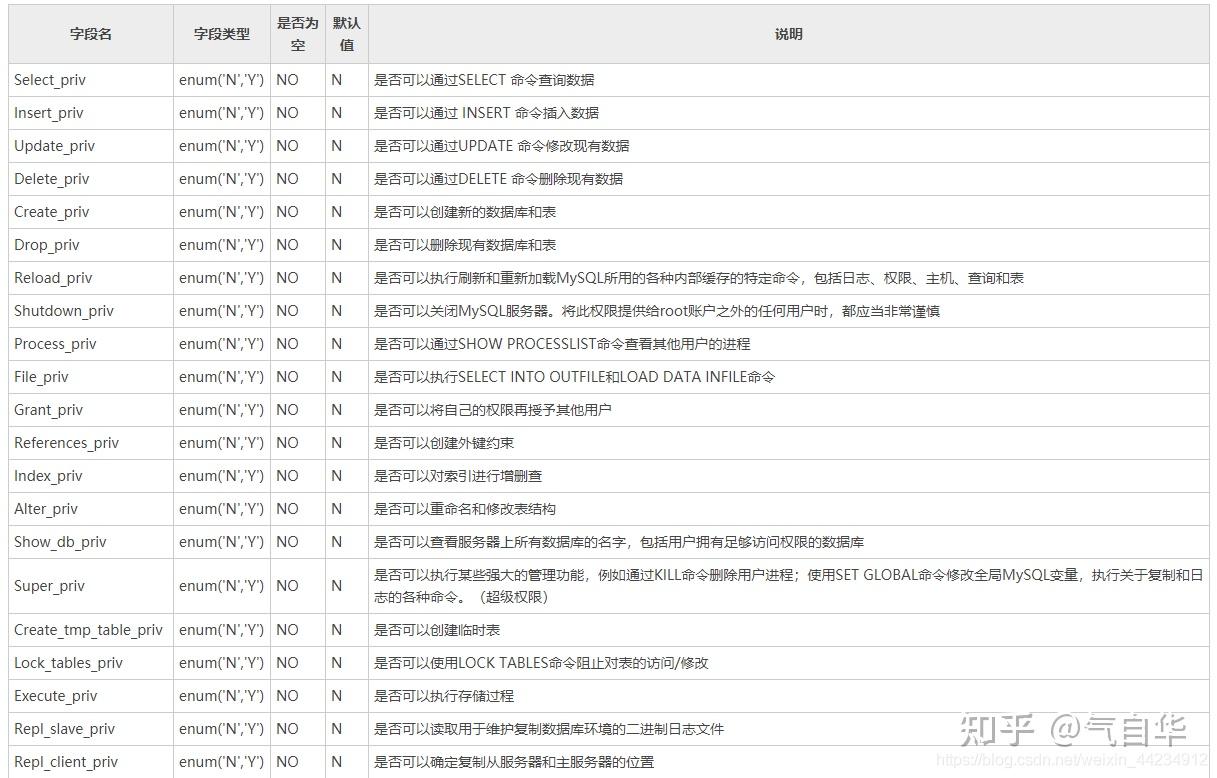 Super_priv     用户可以执行某些强大的管理功能,例如通过KILL命令删除用户进程,使用SET GLOBAL修改全局MySQL变量,执行关于复制和日志的各种命令;超级权限;