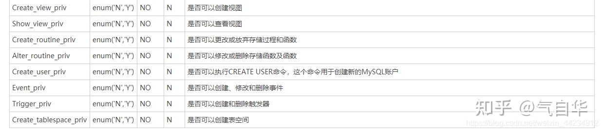 以 priv 结尾的字段,这些字段值的数据类型为 ENUM,可取的值只有 Y 和 N: