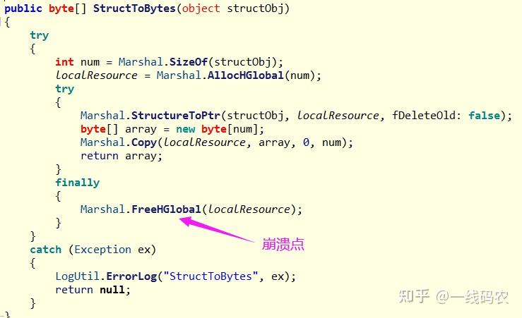 从卦中可以清晰的看到是托管方法 StructToBytes() 引发的,接下来导出这个方法的源码,截图如下: