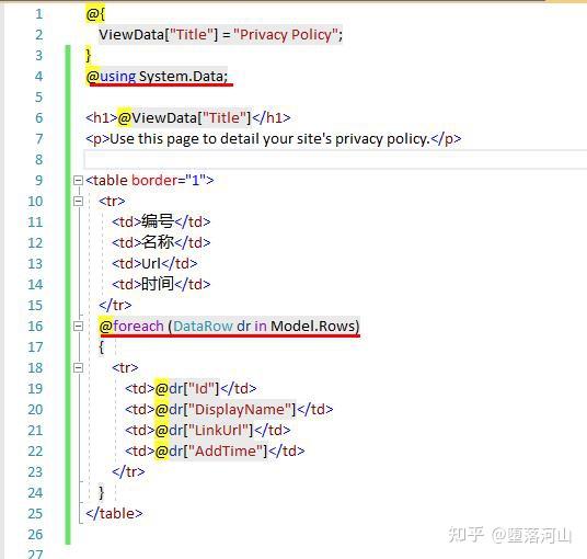 (2).然后在视图页面Privacy.cshtml中,修改代码,因为Action 返回的是dt,所以在视图页中,循环遍历一个DataTable,遍历时要用到DataRow,那么在页面的最前端要引入System.Data