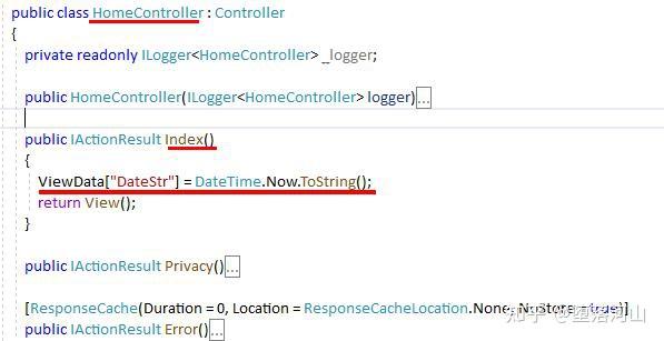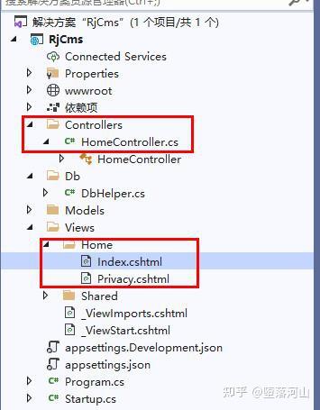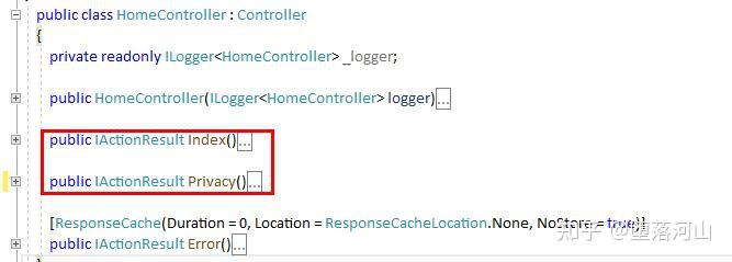 (1).看默认项目的结构,Controller下的HomeController控制着2个视图,即Views下Home文件夹内的Index.cshtml和Privacy.cshtml,在HomeController.cs文件内的情况是:
