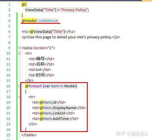 5.修改成List<Menu> list,将dt的数据赋值到Model上,return到view的是list,这样在view页面,可以这样输出: