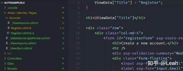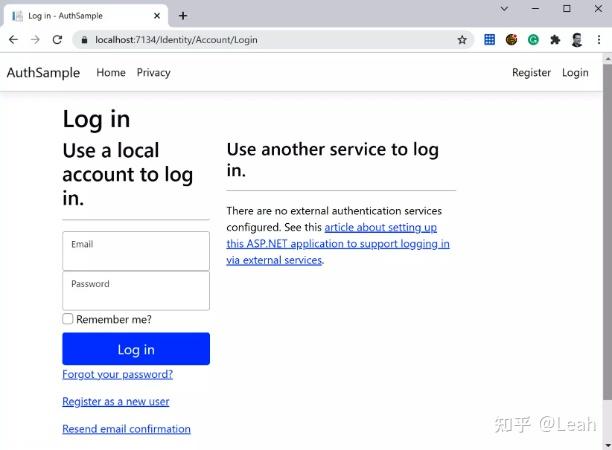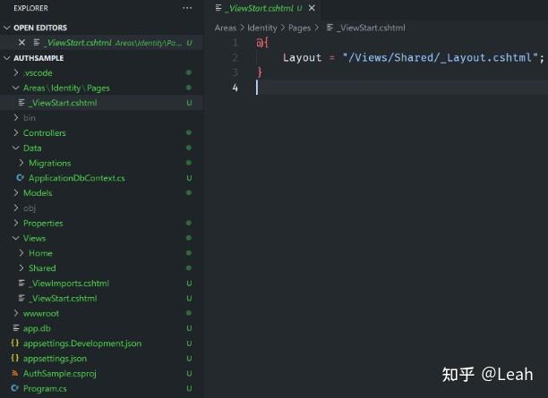 --auth标志创建了一个名为Identity的区域,其中包含_ViewStart.cshtml文件,它引用新项目的_Layout.cshtml文件。实际的登录或注册界面在引用此项目的类库中提供。