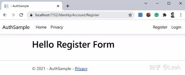 如前所述,项目中已经有一个名为Identity的Area,内有一个Pages文件夹。在这里,我们需要创建一个名为Account的新文件夹,然后放置一个名为“注册”的新Register.cshtml页面在这个文件夹中,并将以下内容放在里面,以查看视图的覆盖是否有效: