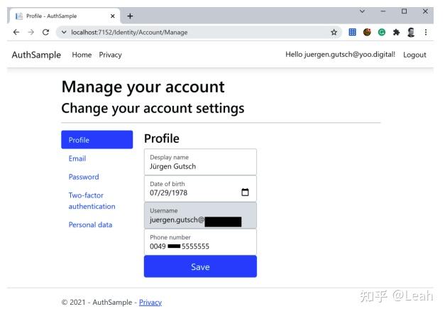 dotnet aspnet-codegenerator identity -dc AuthSample.Data.ApplicationDbContext --files "Account.Manage.Index" -sqlite打开新创建的Index.chtml.cs,并将以下属性放在InputModel类中:
