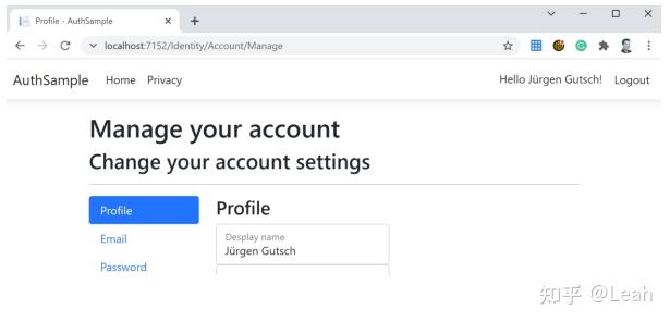 当dotnet watch仍在运行时,浏览器中运行的应用程序应该已经更新。也许你需要重新登录。现在,您应该会在右上角看到显示名称: