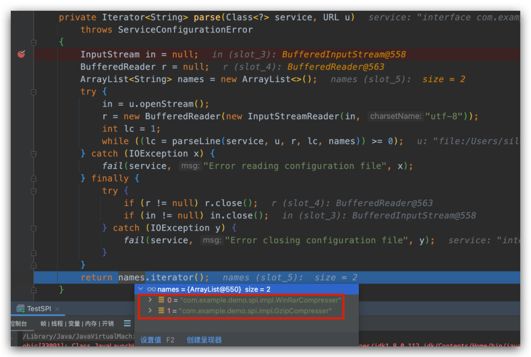 在迭代器中的 parse 方法中,就获取了配置文件中的实现类名称集合,然后在通过反射创建出具体的实现类对象存放到 LinkedHashMap<String,S> providers = new LinkedHashMap<>(); 中。
