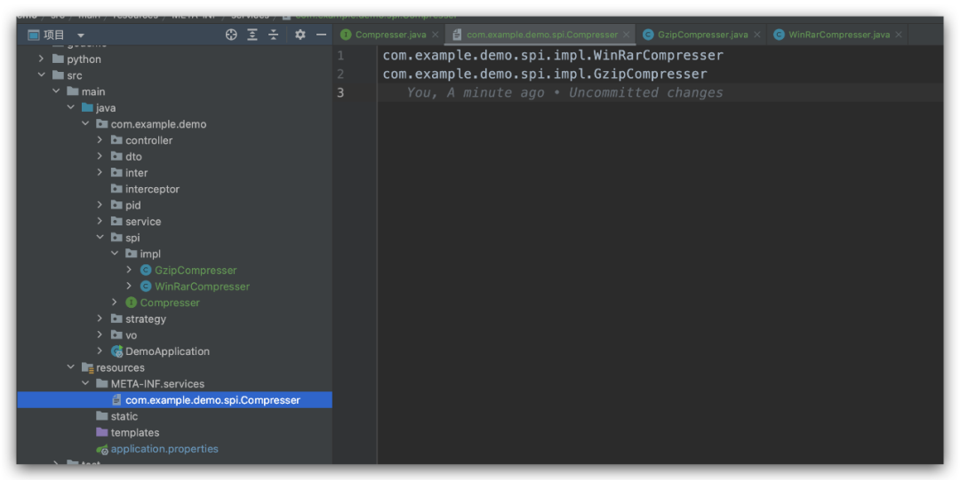 创建配置文件,我们接着在 resources 目录下创建一个名为 META-INF/services 的文件夹,在其中创建一个名为 com.example.demo.spi.Compresser 的文件,其中的内容如下:
