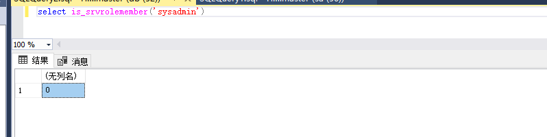 判断当前用户角色(权限): (1)判断是否是sysadmin(dba权限),执行select is_srvrolemember('sysadmin')