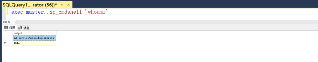 文章测试均在sqlserver2019+win server2019中操作。经过测试sqlserver 2019默认安装,使用dba权限执行whoami不是system权限,这是因为默认安装的sqlserver服务不是用系统账户启动的。