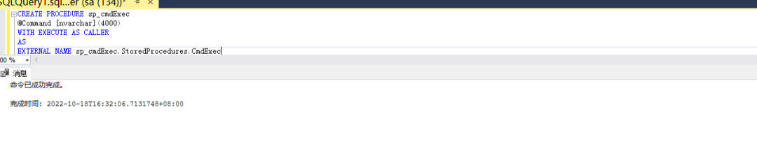 在xp_cmdshell被删除或不能利用是可以考虑利用sp_oacreate,利用前提需要sqlserver sysadmin账户服务器权限为system(sqlserver2019默认被降权为mssql)。sp_oacreate 是一个存储过程,可以删除、复制、移动文件。还能配合 sp_oamethod 来写文件执行系统命令。