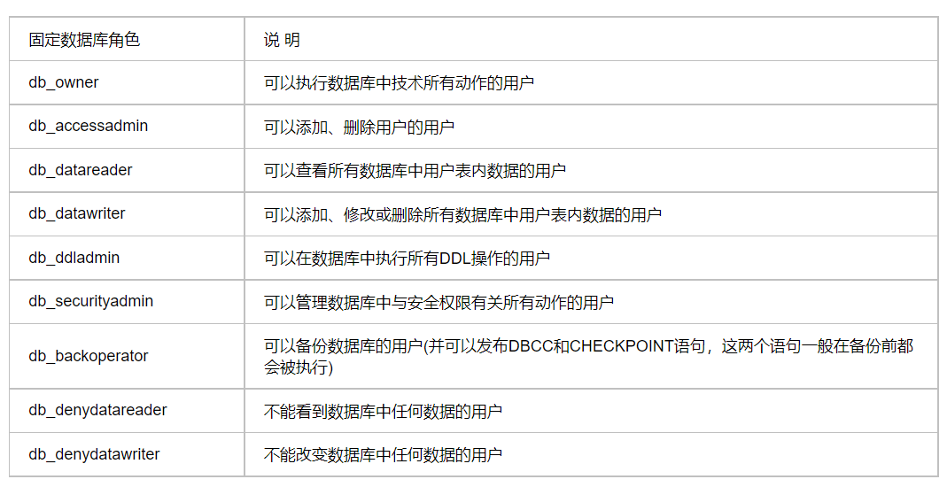 服务器角色: 服务器角色的拥有者只有登入名,服务器角色是固定的,用户无法创建服务器角色。