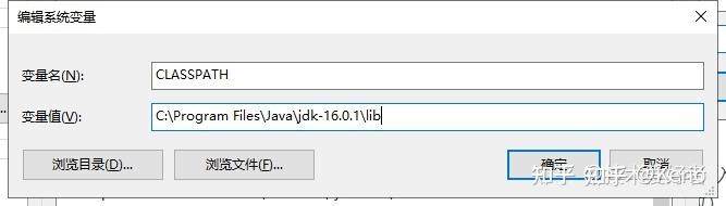 在“系统变量”下“新建”,变量名输入CLASSPATH,变量值输入“C:\Program Files\Java\jdk-16.0.1\lib”(注意此处的jdk版本号与实际安装版本号要一致)