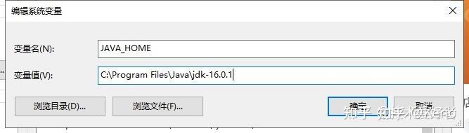 新建变量名输入JAVA_HOME,变量值输入”C:\Program Files\Java\jdk-16.0.1”(注意此处变量值要与实际安装版本安装路径一致,版本号一致)