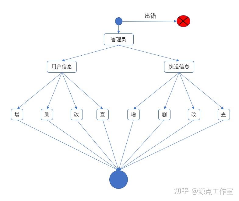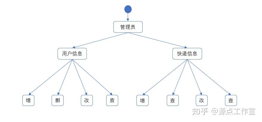 管理员模块,通过这个模块能够查看,添加,删除以及修改用户信息,能够修改快递、删除快递、增加快递、查询快递等操作。在管理员模块里面,所有的具体操作的是嵌套的,详细的活动图如图 2-4 所示。