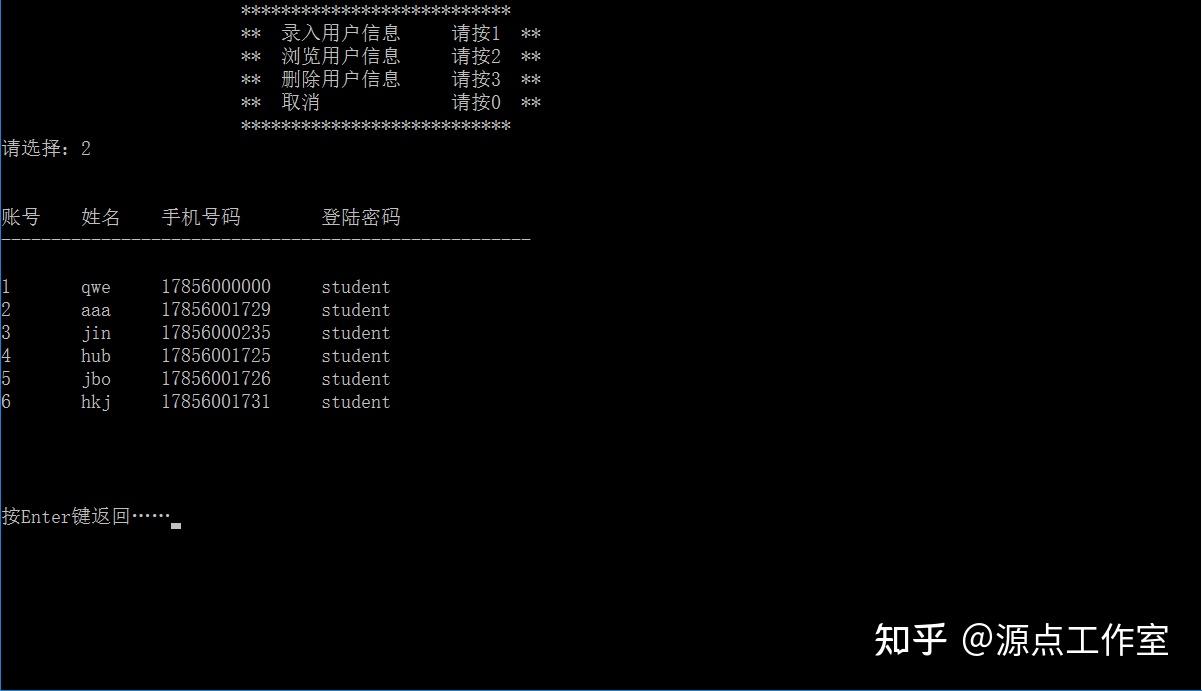 浏览用户信息。可以浏览到用户的账号、姓名、手机号码和登录密码等基本信息,按 enter 键返回,如图 4-5 所示。
