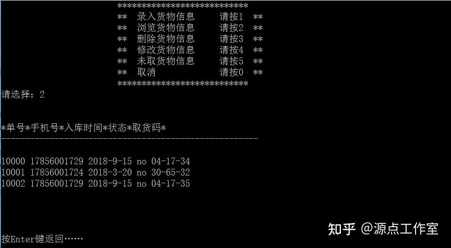 浏览货物信息。可以浏览到用户的快递单号、手机号、入库时间、状态和取货码等信息,按 enter 键返回,如图 4-9 所示。