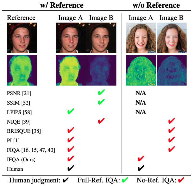 本文提一种基于对抗性框架的新的以人脸为中心的指标,其中一个生成器模拟人脸修复,一个判别器评估图像质量。具体来说,每像素判别器能够提供传统指标所不能提供的可解释的评估。此外,考虑到即使是眼睛、鼻子和嘴巴的微小变化也会显著影响人类的认知,该指标强调了面部主要区域。面向脸部的指标始终以令人印象深刻的幅度超过了现有的一般或人脸图像质量评估指标。
