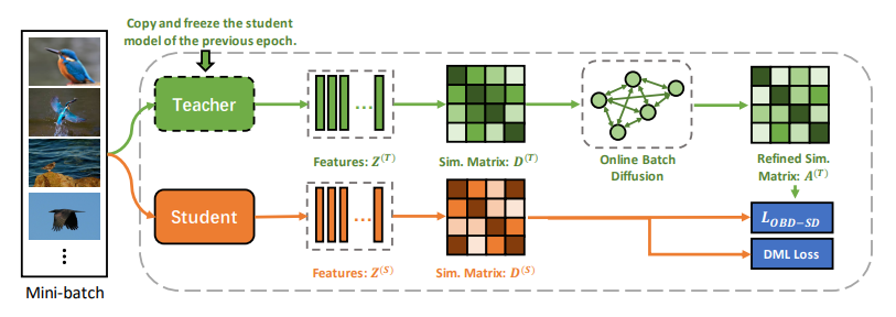 具体来说,首先提出一个简单而有效的 Progressive Self-Distillation(PSD),它在训练过程中从模型本身逐步蒸馏知识。PSD 实现的软距离目标可以在样本之间呈现更丰富的关系信息,这对嵌入表征的多样性是有益的。然后,用 Online Batch Diffusion Process(OBDP)来扩展PSD,这是为了捕捉每个批次中流形的局部几何结构,从而可以揭示批次中样本之间的内在关系,产生更好的软距离目标。需要注意的是,OBDP能够恢复原始PSD得到的不充分的流形关系,并取得明显的性能改进。OBD-SD是一个灵活的框架,可以整合到最先进的(SOTA)DML方法中。