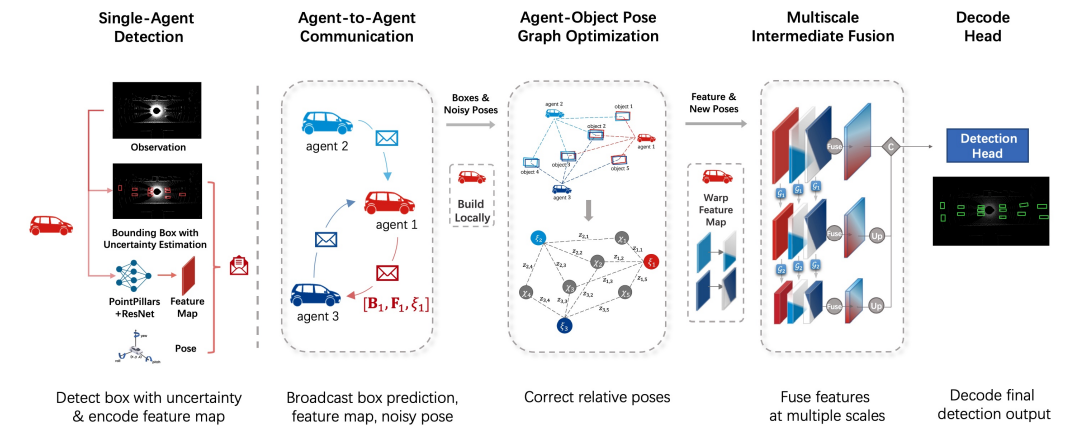 协作式三维目标检测利用多个代理之间的信息交换,在存在传感器损伤(如遮挡)的情况下提高目标检测的准确性。然而,在实践中,由于不完善的定位导致的姿势估计错误会造成空间信息错位,并大大降低协作的性能。为了减轻姿势错误的不利影响,作者提出 CoAlign,一个对未知姿势错误具有鲁棒性的新型混合协作框架。所提出的解决方案依赖于一种新型的代理-物体姿势图建模,以增强合作代理之间的姿势一致性。此外,采用多尺度数据融合策略,在多个空间分辨率上聚集中间特征。