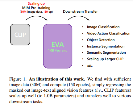EVA,一个以视觉为中心的基础模型,只用公开的数据来探索规模化的视觉表现的极限。EVA 是一个虚构的 ViT,它被预先训练来重建被掩码图像-文本对齐的视觉特征,以可见的图像斑块为条件。通过这个预案任务,可以有效地将EVA扩展到10亿个参数,并在广泛的代表性视觉下游任务上创造了新的记录,如图像识别、视频动作识别、目标检测、实例分割和语义分割,而无需大量的监督训练。此外,作者发现扩展EVA的量变引起了迁移学习性能的质变,这在其他模型中是不存在的。