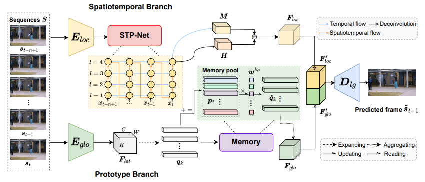 为此,本次工作中,作者提出一个双分支模型,Local-Global Normality Network(LGN-Net),以同时学习局部和全局正常性。具体来说,一个分支利用时空预测网络从连续帧中学习外观和运动的演变规律,作为局部规范性,而另一个分支则通过记忆模块记忆整个视频的原型特征,作为全局规范性。LGN-Net通过融合局部和全局规范性,实现了代表正常和异常实例的平衡。与利用单一常态相比,融合后的常态使模型对各种场景更有泛化性。