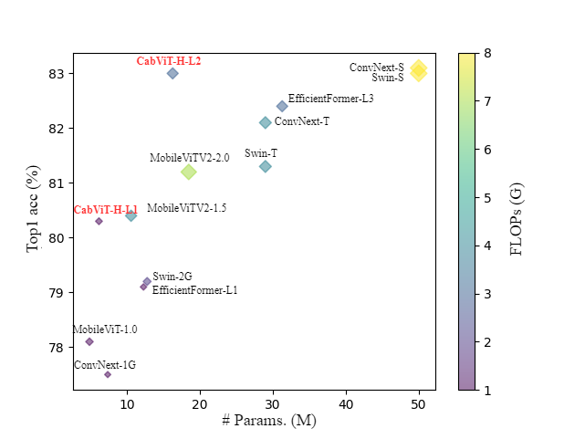 例如,在不需要知识蒸馏来加强训练的情况下,CabViT在Imagenet上仅用1630万个参数和约3.9G FLOPs就达到了83.0%的最高准确率,与ConvNext相比,节省了近一半的参数和13%的计算成本,同时获得了0.9%的高准确率;与蒸馏的EfficientFormer相比,使用52%的参数但获得了0.6%的准确率。