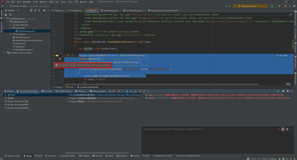然后又换成了Rider,既然调试看不到中间变量的值,那就直接Console.WriteLine()出来,结果Console在当前上下文中根本就不存在,如下: