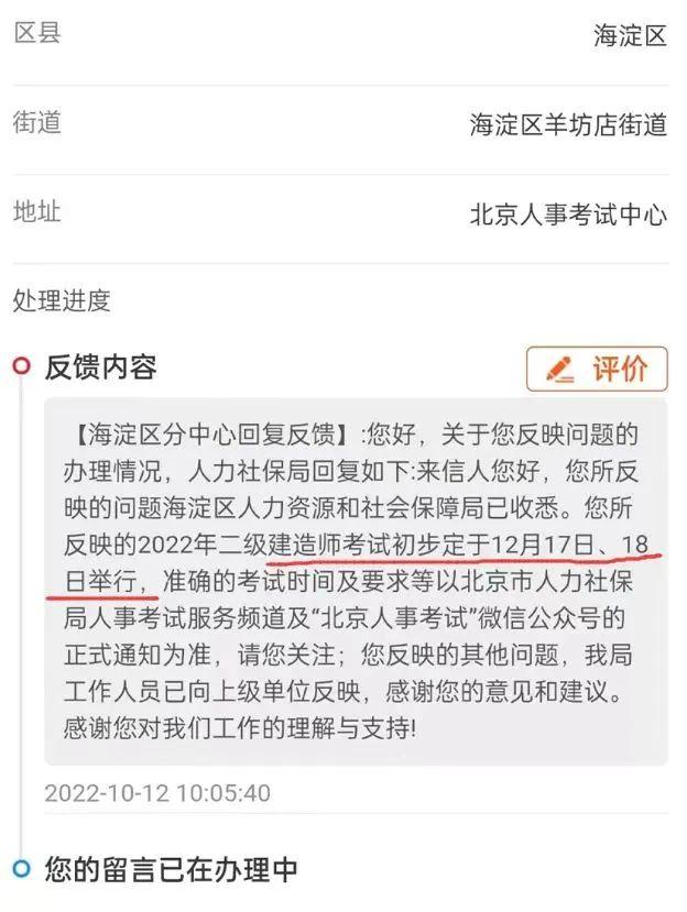 【海淀区分中心回复反馈】:您好,关于您反映问题的办理情况,人力社保局回复如下:来信人您好,您所反映的问题海淀区人力资源和社会保障局已收悉。您所反映的2022年二级建造师考试初步定于12月17日、18日举行。