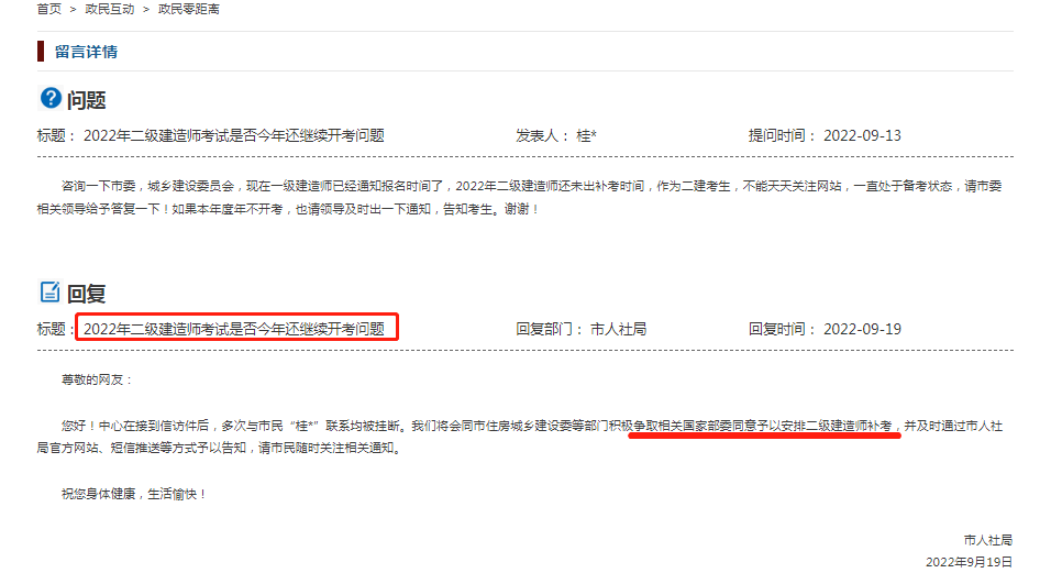 官方回复:我们将会同市住房城乡建设妥等部门积极争取相关国家部委同意予以安排二级建造师补考,并及时通过市人社局官方网站、短信推送等方式予以告知,请市民随时关注相关通知。