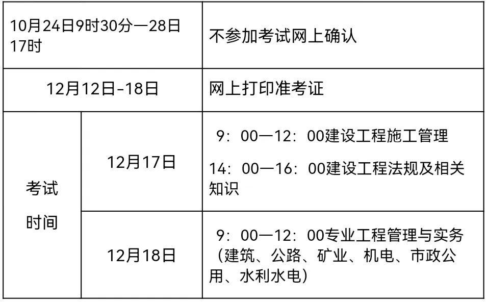 12月17日  9:00—12:00建设工程施工管理14:00—16:00建设工程法规及相关知识12月18日  9:00—12:00专业工程管理与实务