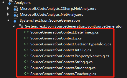 [JsonSourceGenerationOptions(WriteIndented = true)][JsonSerializable(typeof(Student))] [JsonSerializable(typeof(Teacher))]internal partial class SourceGenerationContext : JsonSerializerContext{}分析器下会出现一些自动生成的代码: