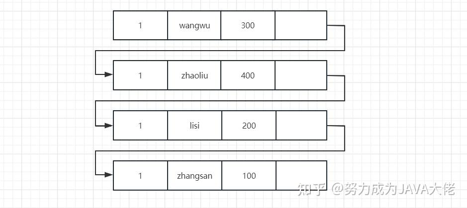 此时红色指针处生成的readview应该是:[100,300],400,查询到的结果应该是wangwu,如果没有当前节点修改,那么查询到的结果应该是zhaoliu,生成的版本链应该如下图: