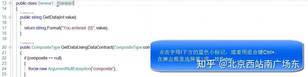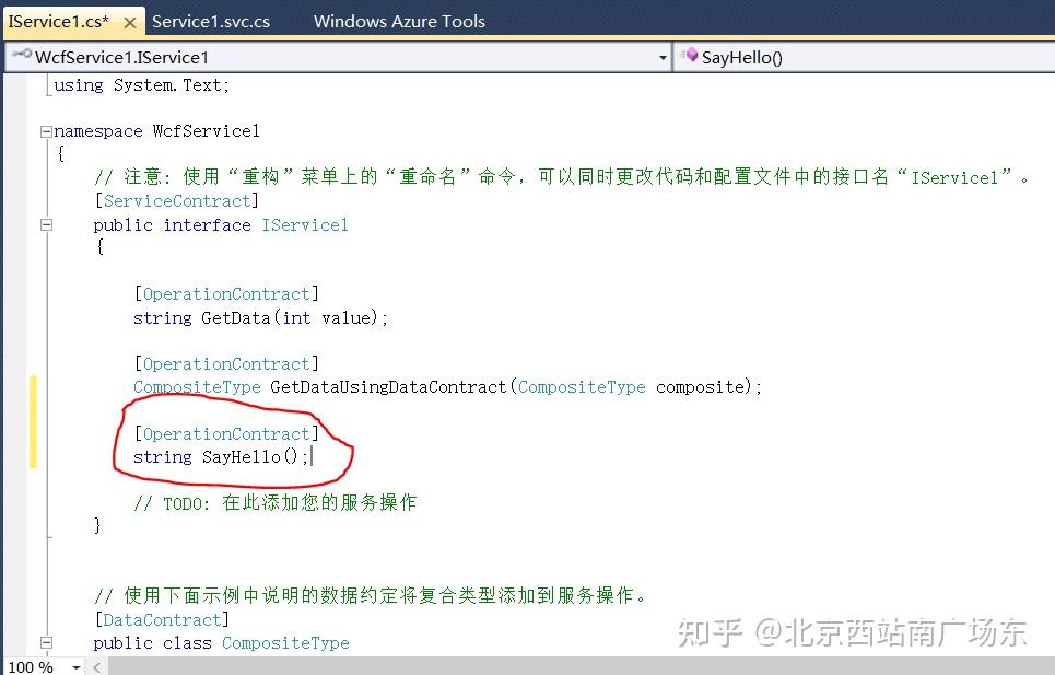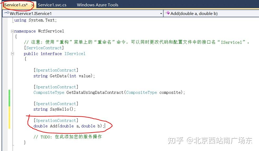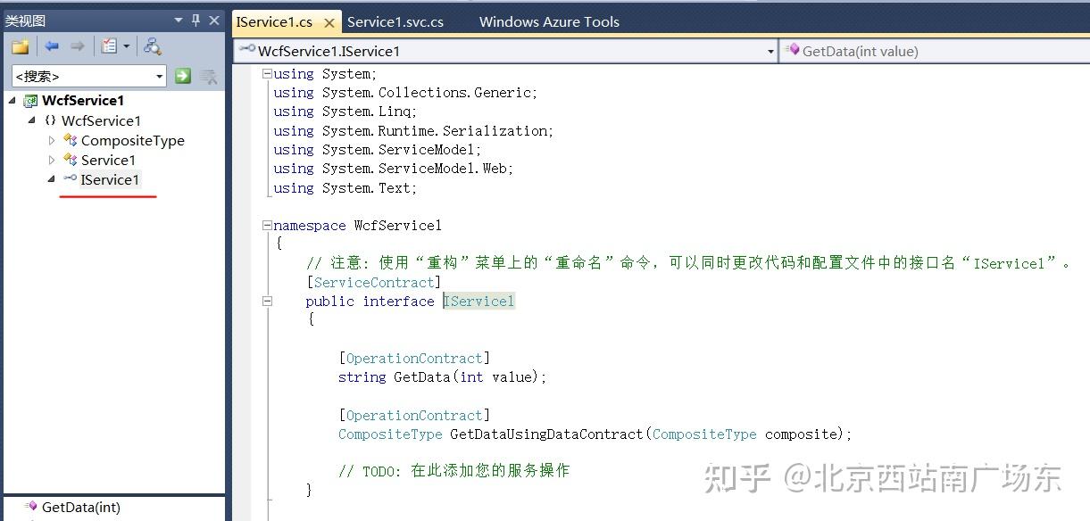 双击进入左侧 IService1 的代码编辑界面,进行一些修改