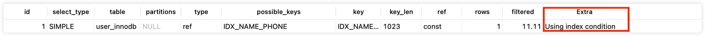由于之前我给name字段创建了索引,导致一直没有使用索引下推,EXPLAIN语句显示使用了name索引,而不是name和phone的联合索引;删除name索引之后,才获得上述截图的效果。大家做实验的时候需要注意。