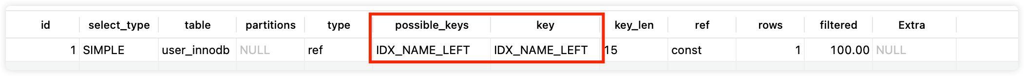 EXPLAIN SELECT * FROM user_innodb WHERE name = "蝉沐风" AND phone LIKE "%6606";