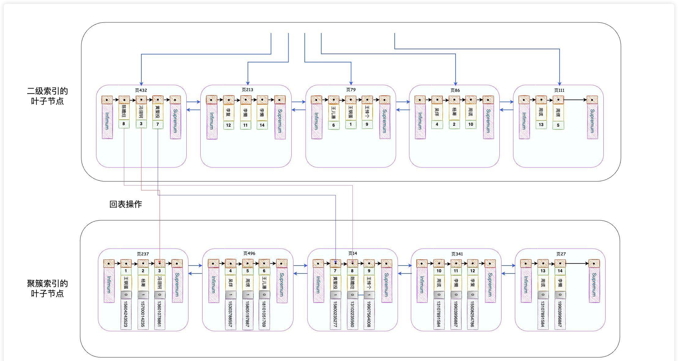 上图中我以name二级索引为例,并且只画出了二级索引的叶子节点和聚簇索引的叶子节点,省略了两棵B+树的非叶子节点。