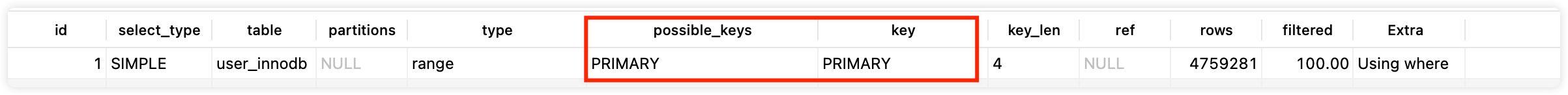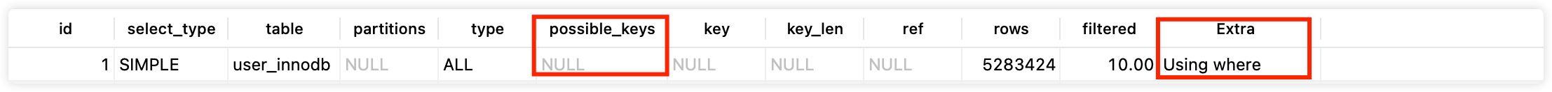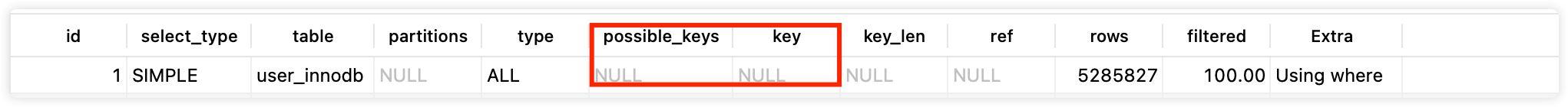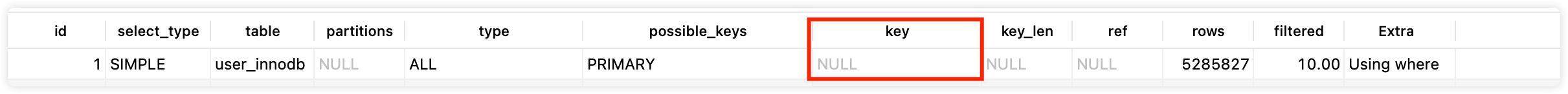 EXPLAIN SELECT * FROM user_innodb WHERE id + 1 = 1100000;