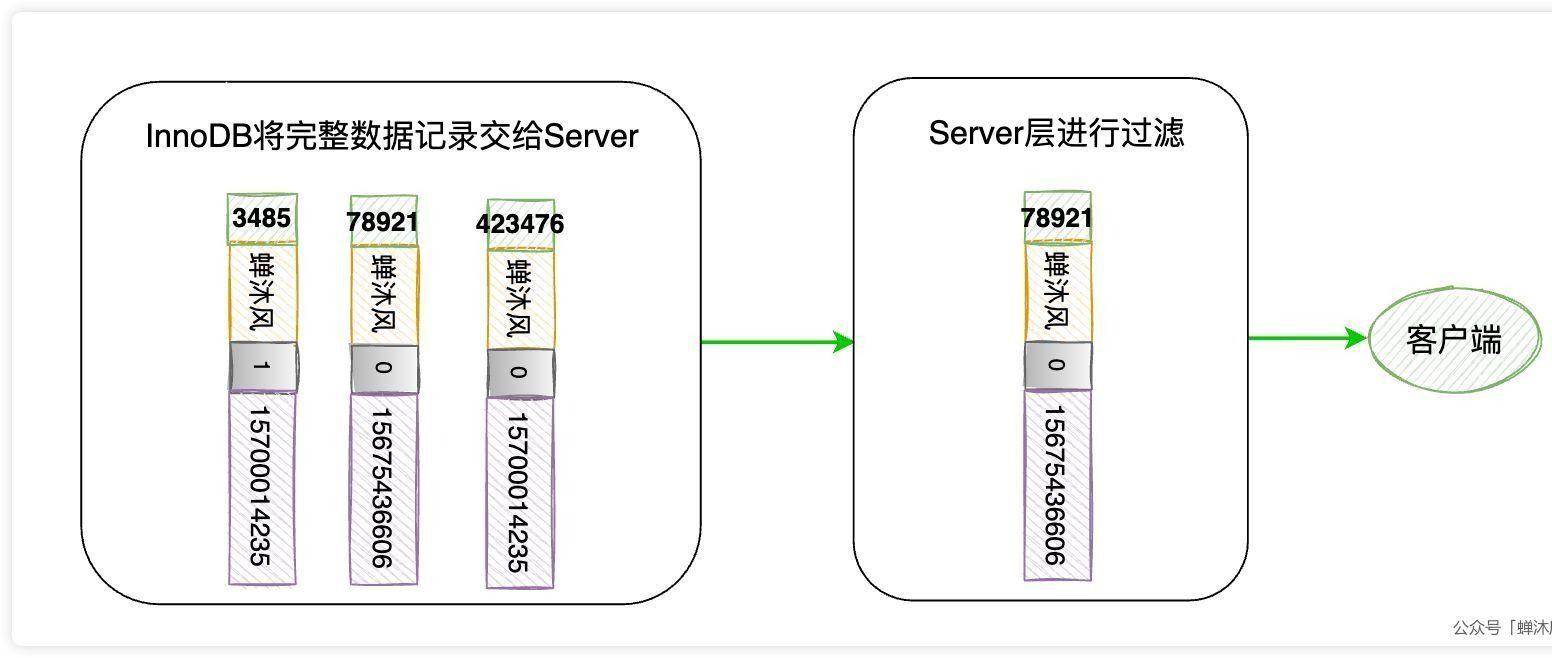 再回顾一下,我们第一步已经通过name = "蝉沐风"在联合索引的叶子节点中找到了符合条件的3条记录,而且phone字段也恰好在联合索引的叶子节点的记录中。这个时候可以直接在联合索引的叶子节点中进行遍历,筛选出尾号为6606的记录,找到主键值为78921的记录,最后只需要进行1次回表操作即可找到符合全部条件的1条记录,返回给Server层。