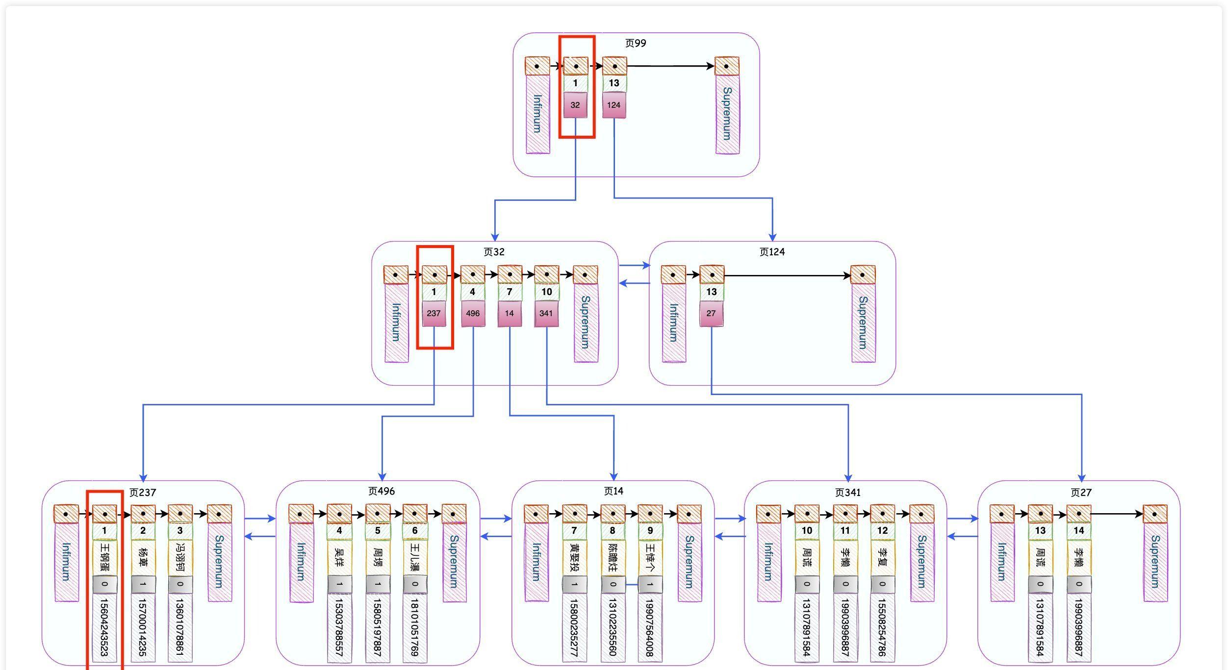 • 叶子节点所在的页通过双向链表进行关联,遍历的速度比较快;