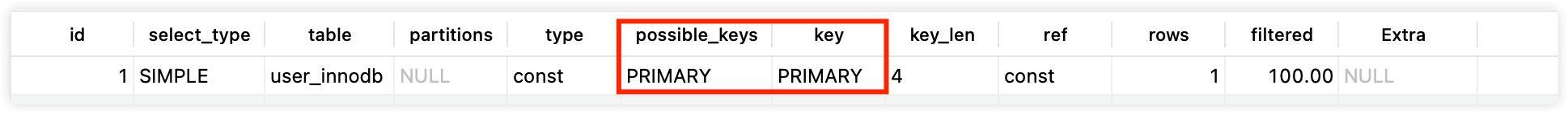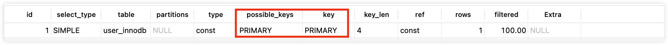 EXPLAIN SELECT * FROM user_innodb WHERE id = '1099999';