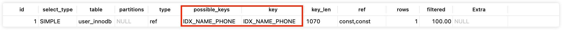 EXPLAIN SELECT * FROM user_innodb WHERE phone = "13203398311" AND name = '蝉沐风';