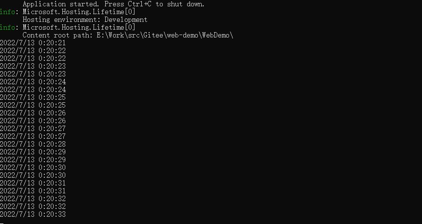 builder.Services.AddHostedService<BackgroundServiceDemo>();大功告成,F5看看效果吧