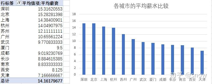 按城市来分,北京对数据分析职位的需求量最多,机会最大。深圳的平均薪资水平最高,其次是北京。