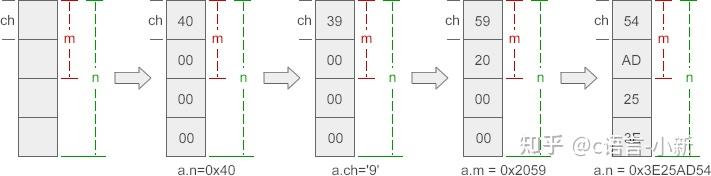 成员 n、ch、m 在内存中“对齐”到一头,对 ch 赋值修改的是前一个字节,对 m 赋值修改的是前两个字节,对 n 赋值修改的是全部字节。也就是说,ch、m 会影响到 n 的一部分数据,而 n 会影响到 ch、m 的全部数据。