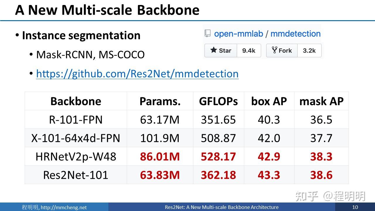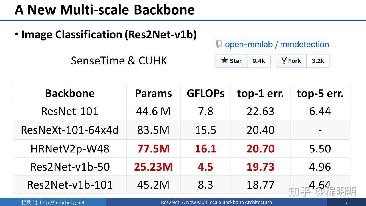 虽然该方法很简单。但是这种增强的多尺度表征在很多任务上取得了优异的性能提升。以分类任务为例,我们在mmdetection上进行了对比实验。该benchmark是由商汤科技和香港中文联合牵头维护的一个优化程度非常高的函数库。与之前在该benchmark上长时间排名榜首的微软公司的HRNet相比,我们的方法仅需要1/3左右的参数量和1/4左右的计算量就可以取得更好的性能,识别错误率更低。