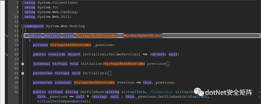 首先来看VirtualPathProvider类,此类中定义了的FileExists、GetFile等方法非常有用,笔者也是重写这两个方法达成虚拟WebShell,先不谈继续往下看此类被定义在 System.Web.Hosting 命名空间里使 Web 应用程序可以从虚拟文件系统中检索注册的资源,该类位于System.Web.dll文件,自身是一个抽象类继承于父类MarshalByRefObject,因为是抽象类不能直接被实例化所以笔者需要自定义一个类去实现它。VirtualPathProvider.FileExists()表示文件是否存在于虚拟文件系统中告诉系统是否存在请求路径,如果存在则事件通知继续调用 GetFile 方法,VirtualPathProvider.GetFile() 表示从虚拟文件系统中获取一个虚拟文件,代码如下